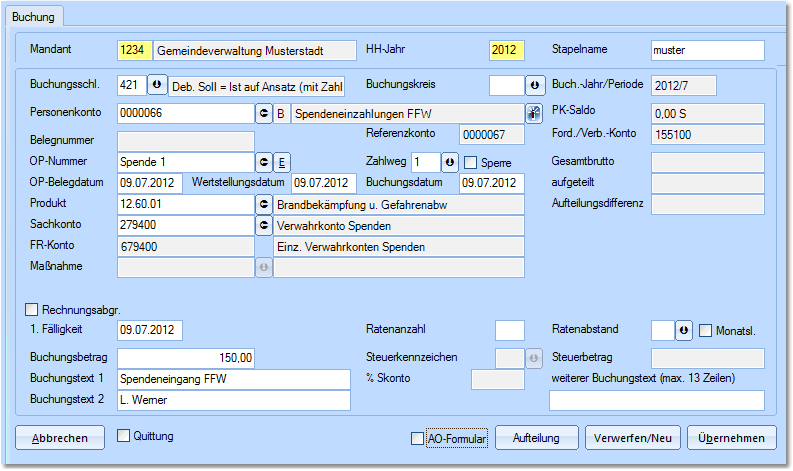 Bei der Sollstellung wird ausschließlich auf das eigens für die Verwahrbuchung angelegte Personenkonto gebucht, unabhängig von der tatsächlich leistenden natürlichen oder juristischen Person.