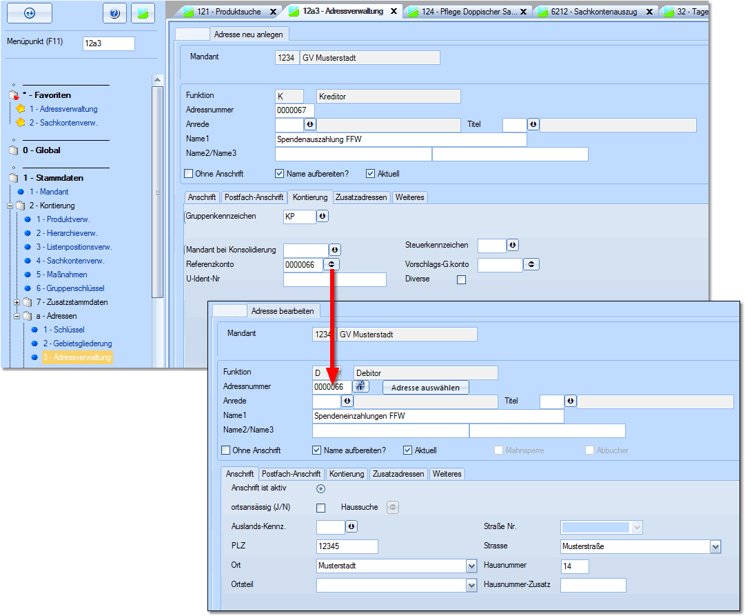 Außerdem sind für den Verwahrbuchungsvorgang 2 Personenkonten (Debitor und Kreditor) anzulegen, die in der Adressverwaltung über das Feld „Referenzkonto“ miteinander gekoppelt werden.