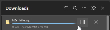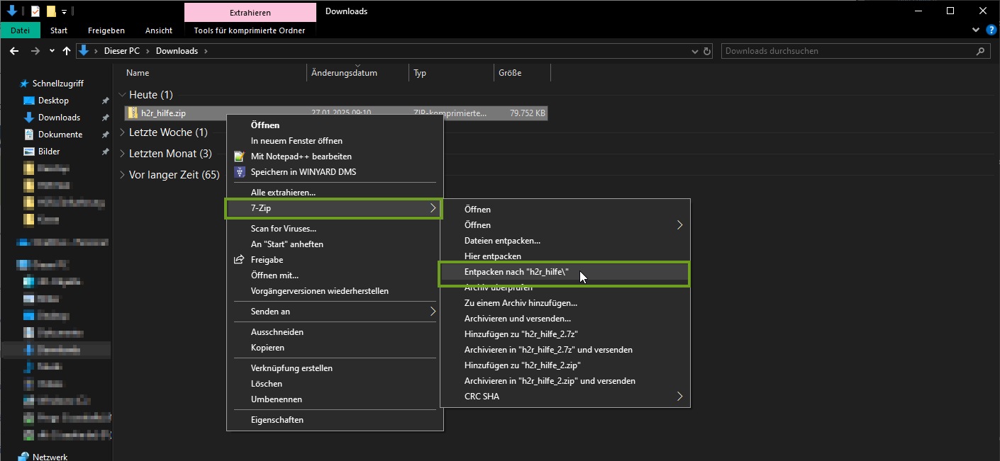 Im Explorer kann der entstandene gezipte Ordner h2r_hilfe.zip folgendermaßen entpackt werden.