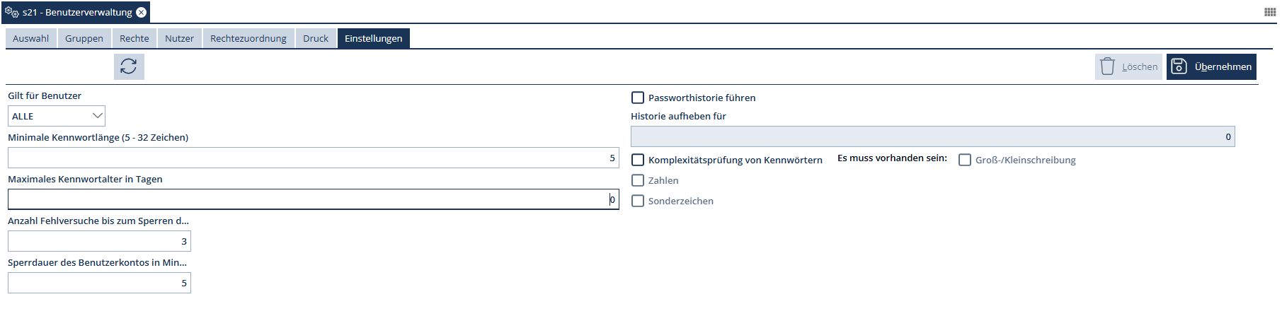 Dabei ist die mindest Anfoderung, dass das Passwort 5 Zeichen lang ist. Nach drei fehlerhaften Anmeldeversuchen, wird der jeweilige Nutzer automatisch gesperrt. Dieser ist für eine definierbare Zeit gesperrt.