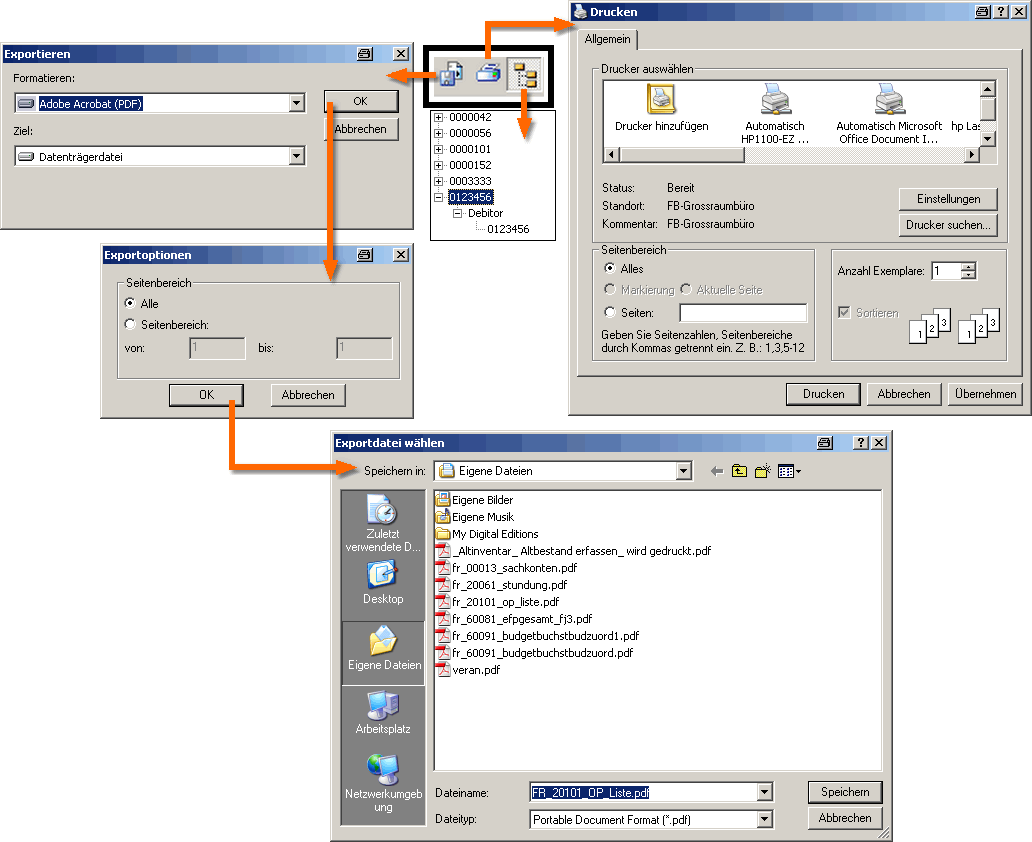 Über das linke Symbol (Diskette) ist die Ausgabe einer Datenträgerdatei (z. B. pdf-Datei) möglich. Durch Klick auf das mittlere Symbol (Drucker) kann die Auswertung auf einem installierten Drucker ausgegeben werden. Das rechte Symbol (Verzeichnisstruktur) ermöglicht bei umfangreichen Reports ein schnelles Wechseln zwischen unterschiedlichen Vorschauseiten (z. B. zum Nachdruck einzelner Seiten)