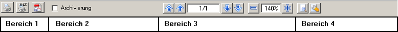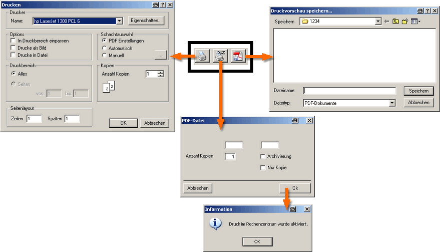 Über das linke Symbol (Drucker) kann die Auswertung auf einem installierten Drucker ausgegeben werden. Durch Klick auf das mittlere Symbol (Drucker DLZ) ist Erstellung eines Druckjobs für einen Rechenzentrumsdrucker möglich. Das rechte Symbol (PDF) ermöglicht die Ausgabe einer Datenträgerdatei (z. B. pdf-Datei)