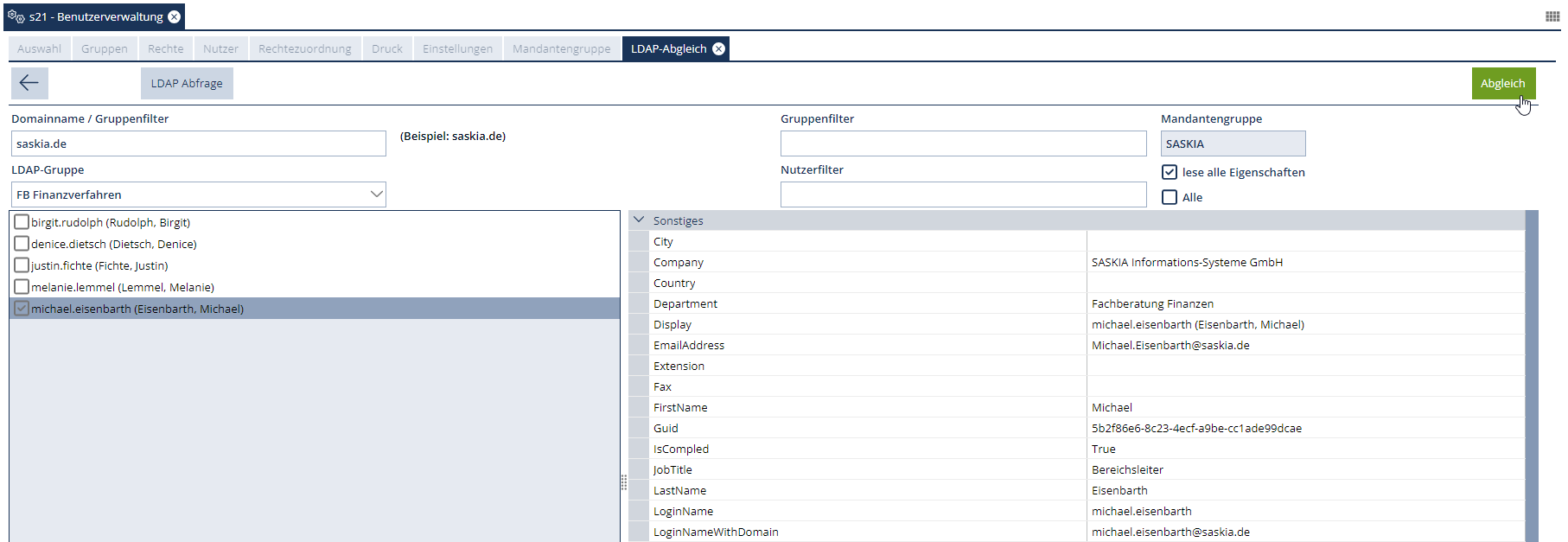 Wird der Abgleicht mittels LDAP durchgeführt, ist der Domainname anzugeben und danach die gewünschte LDAP-Gruppe auszuwählen und der Abgleich zu starten.