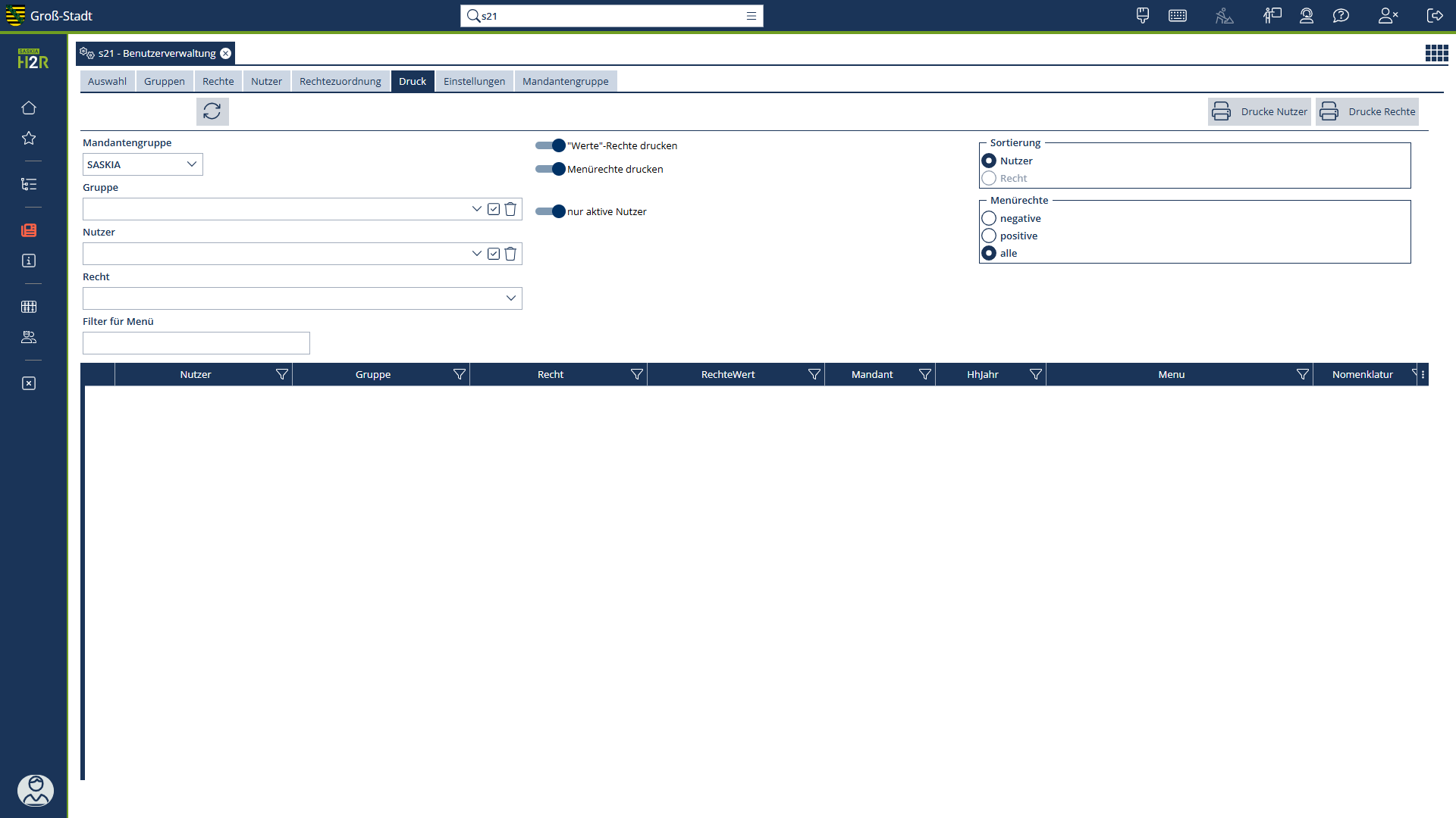 | Drucke Rechte | Erstellung einer Übersicht der Rechte anhand der vorher definierten Druckparameter je Nutzer. |
