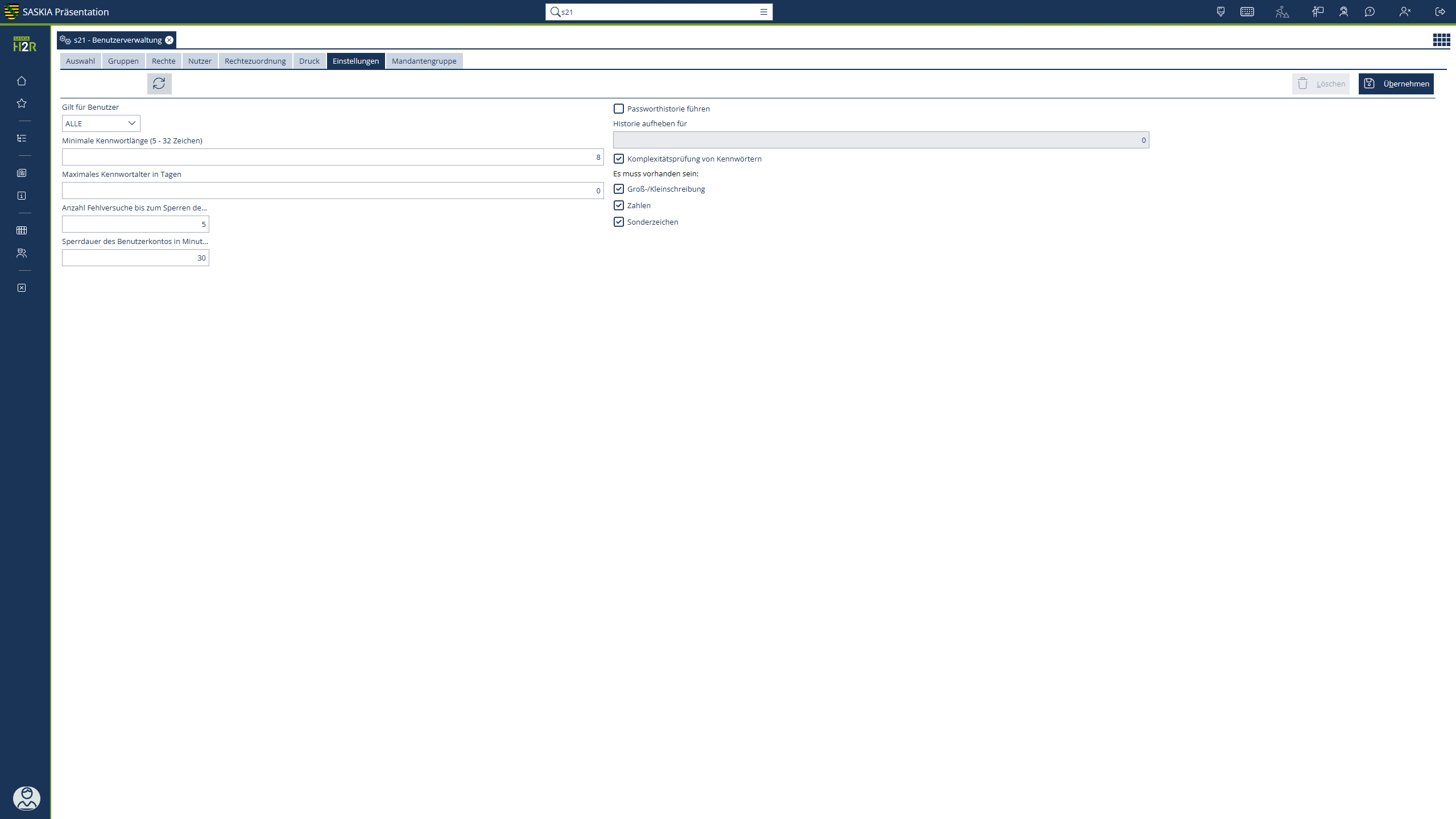 | Passworthistorie führen | Mit aktiver Funktion werden alte Kennwörter der Benutzer gespeichert. |