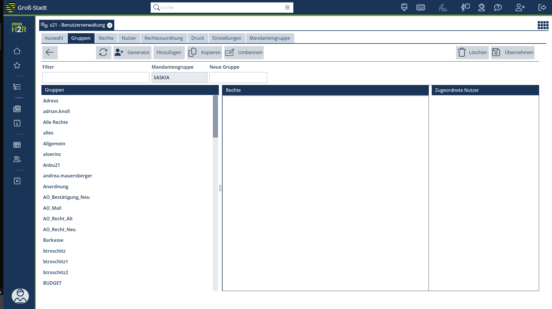 | Verwaltung der Gruppen | Mit einem Klick auf den Button wird die Rechtegruppenverwaltung aufgerufen. |