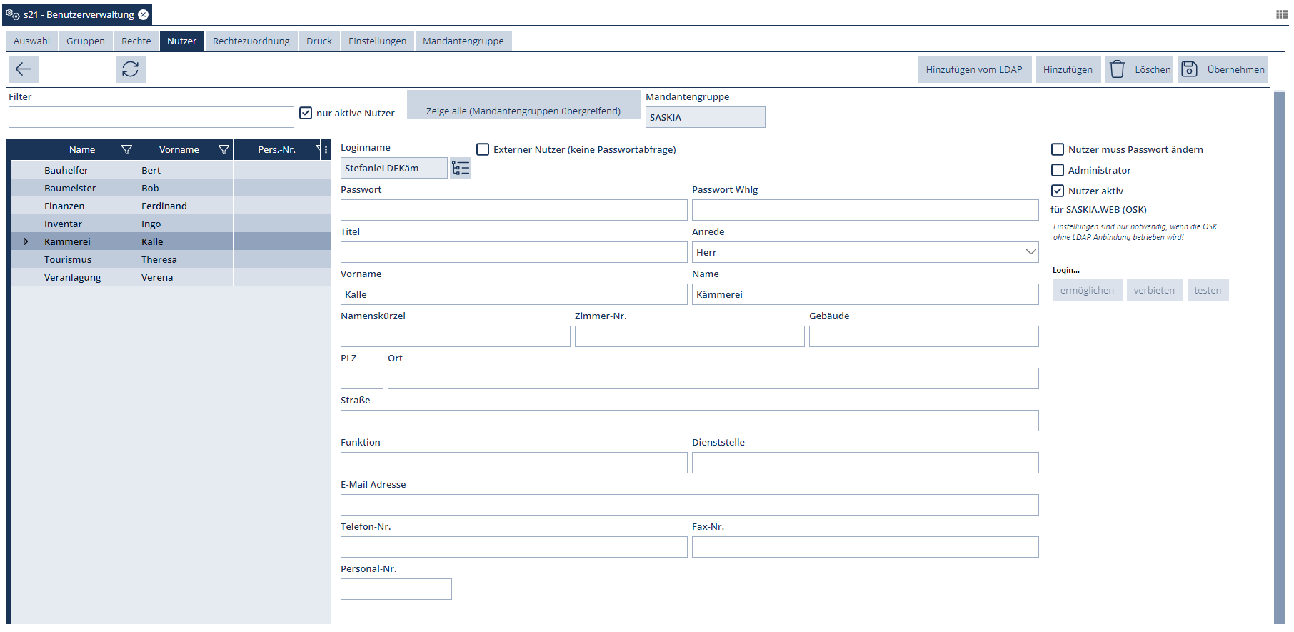 In diesem Register können Benutzer manuell angelegt werden oder auch über den LDAP-Abgleich aus dem Active Directory importiert werden.