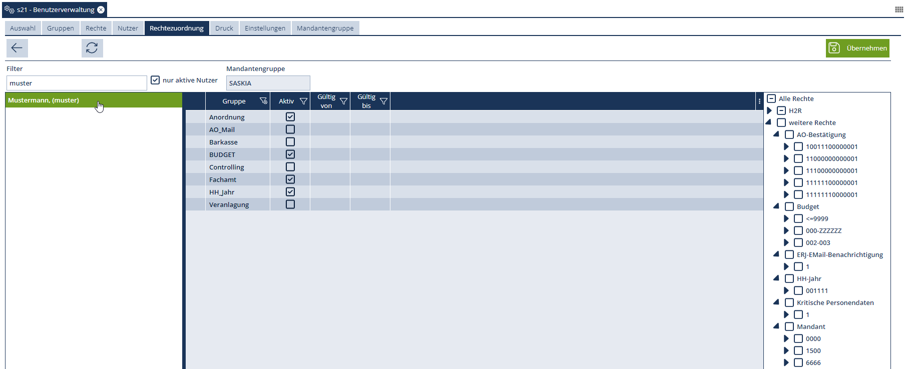 Auf der rechten Seite wird eine Berechtigungsstruktur für den ausgewählten Benutzer angezeigt, der alle gesetzten Berechtigungen übersichtlich darstellt.