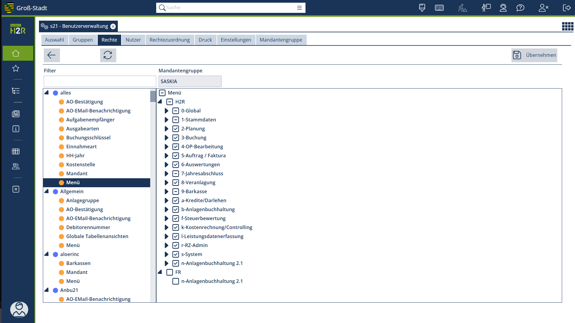 Im oben gezeigten Beispiel wurde das Menürecht der Gruppe „alles“ aufgerufen und hier kann nun definiert werden, auf welche Menüpunkte die Benutzer dieser Gruppe Zugriff haben.