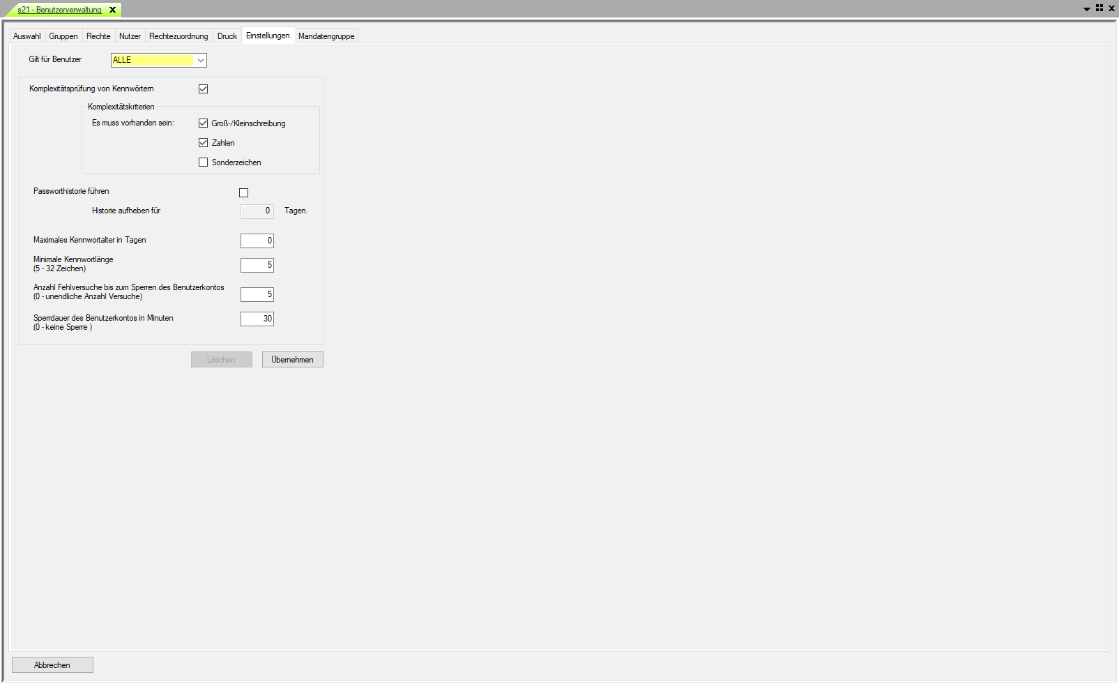 In diesem Menüpunkt können diverse Kennwortrichtlinien festgelegt werden.
