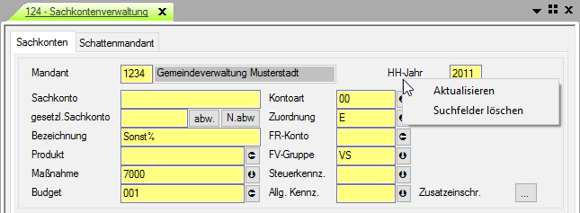 Such- bzw. Selektionsfelder dienen zur gezielten Abfrage von Einzelsätzen aus relativ großen Datensatzmengen (Adressverwaltung, Buchungsrecherche, usw.) und sind standardmäßig im Programm gelb dargestellt. Bei abweichenden Farbeinstellungen kann unter Global | Fenster | Einstellungen über den gleichnamigen Button dieser Standard wiederhergestellt werden. Grundsätzlich wirken alle Suchfelder einer Maske gemeinsam und jede Eingabe in ein weiteres Suchfeld dieser Maske spezifiziert den gesuchten Datensatz genauer. Die Anzeige liefert nur Werte, die alle eingegebenen Suchbedingungen erfüllen (logische UND-Verknüpfung). Vor Beginn einer neuen Abfrage können alle vorhandenen Einträge in Suchfeldern durch Rechtsklick auf einen freien Platz des aktuellen Dialogfensters (graue Oberfläche) und Auswahl des Punktes "Suchfelder löschen" im Untermenü entfernt werden.